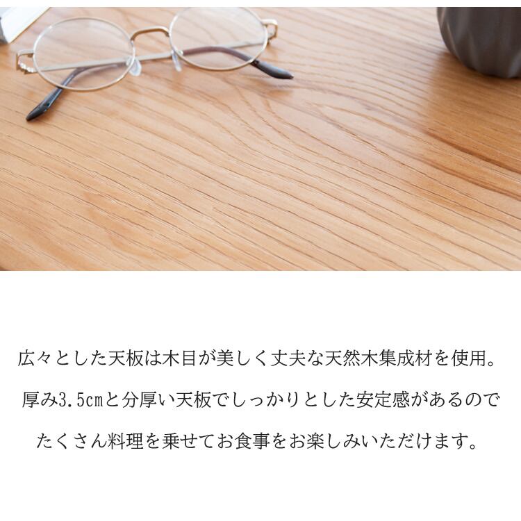 広々とした天板は木目が美しく丈夫な天然木集成材を使用しており、厚さ(約)3.5cmと分厚い天板でしっかりとした安定感があります。