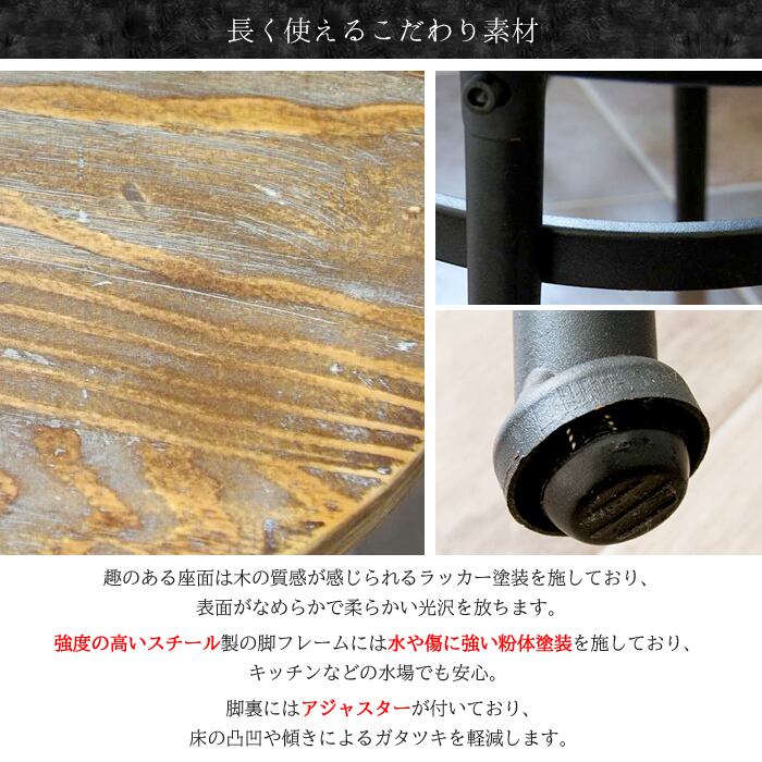 脚フレームには強度の高いスチール性のフレームを採用しており、水や傷に強い粉体塗装を施しているので、キッチンなどの水場でも安心してご使用いただけます。