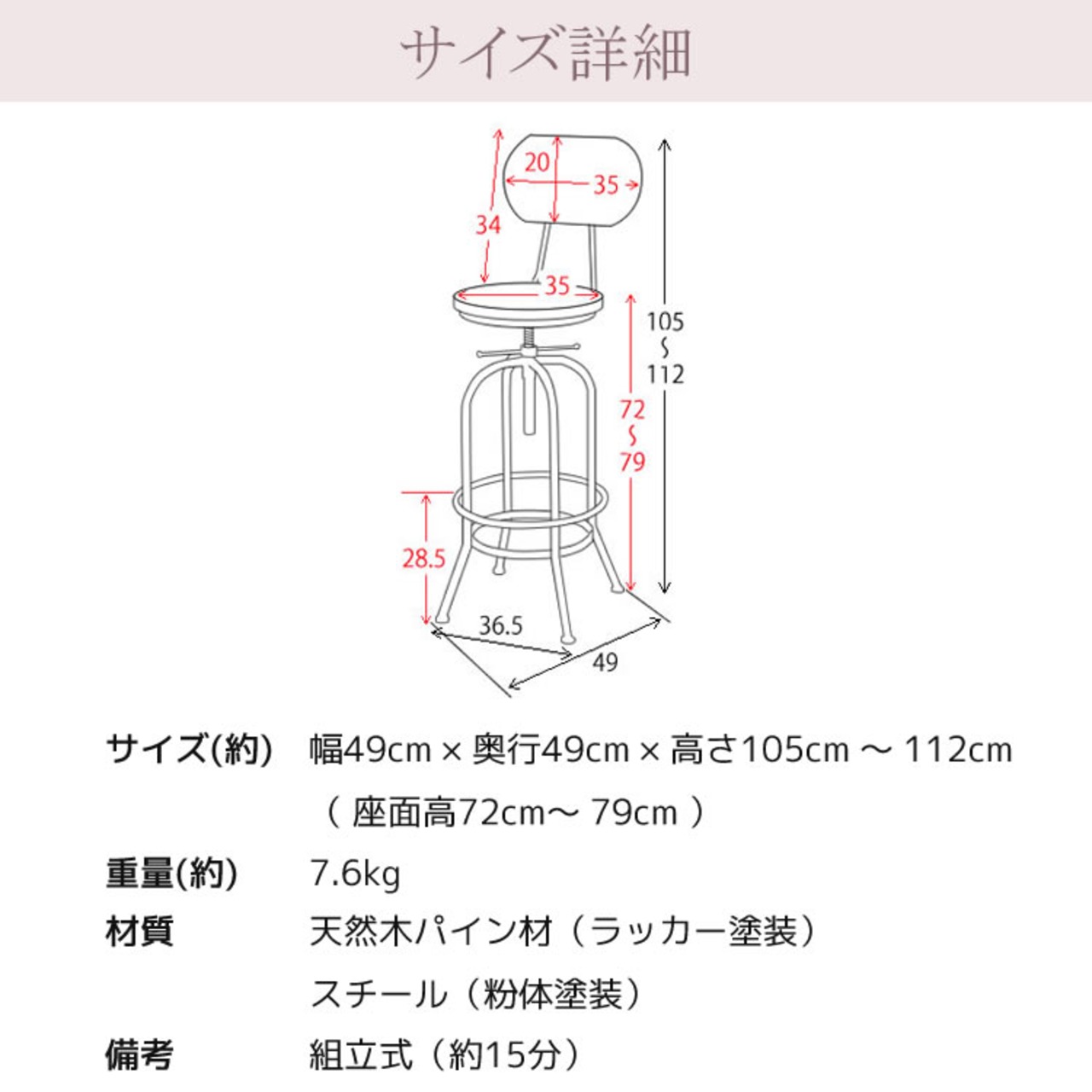 ■商品サイズ(約):幅49cm、奥行49cm、高さ105cm〜高さ112cm、座面高72cm〜座面高79cm