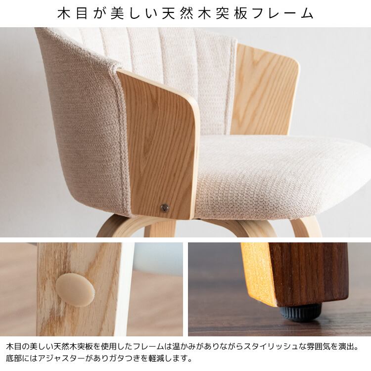 木目が美しい天然木突板を使用したフレームは温かみがありながらスタイリッシュな雰囲気を演出し、脚の底部にはアジャスターが付いているので、ガタつきを軽減します。