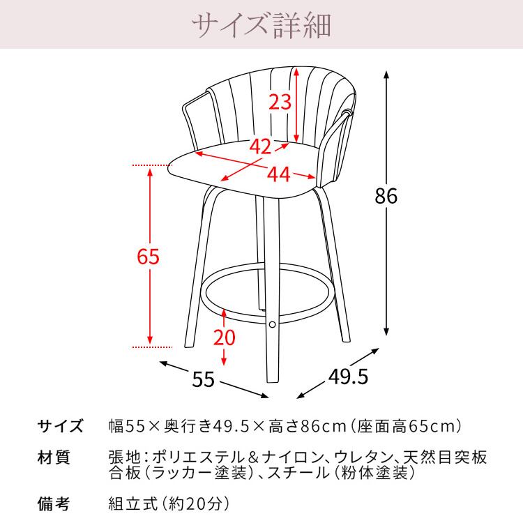 ■商品サイズ(約):幅55cm、奥行49.5cm、高さ86cm、座面高65cm