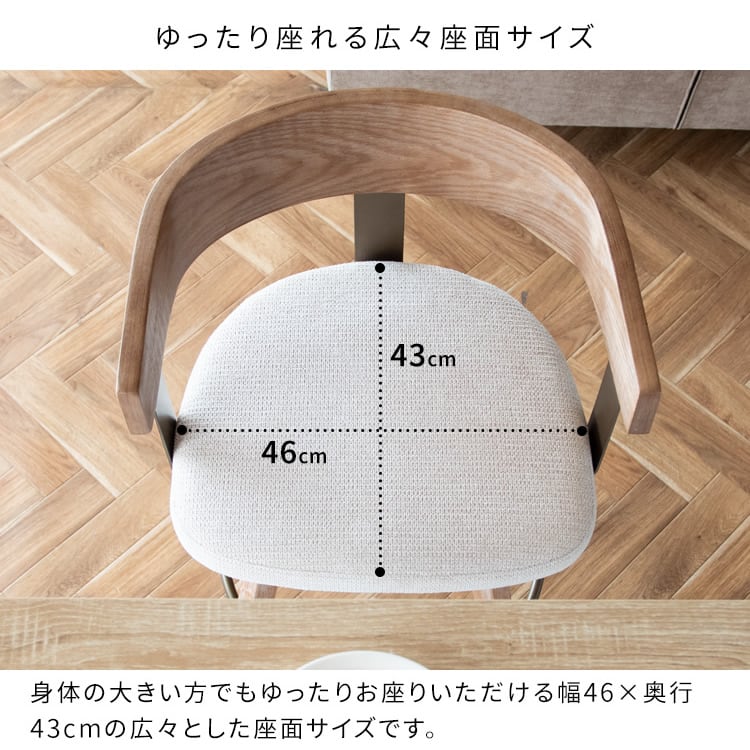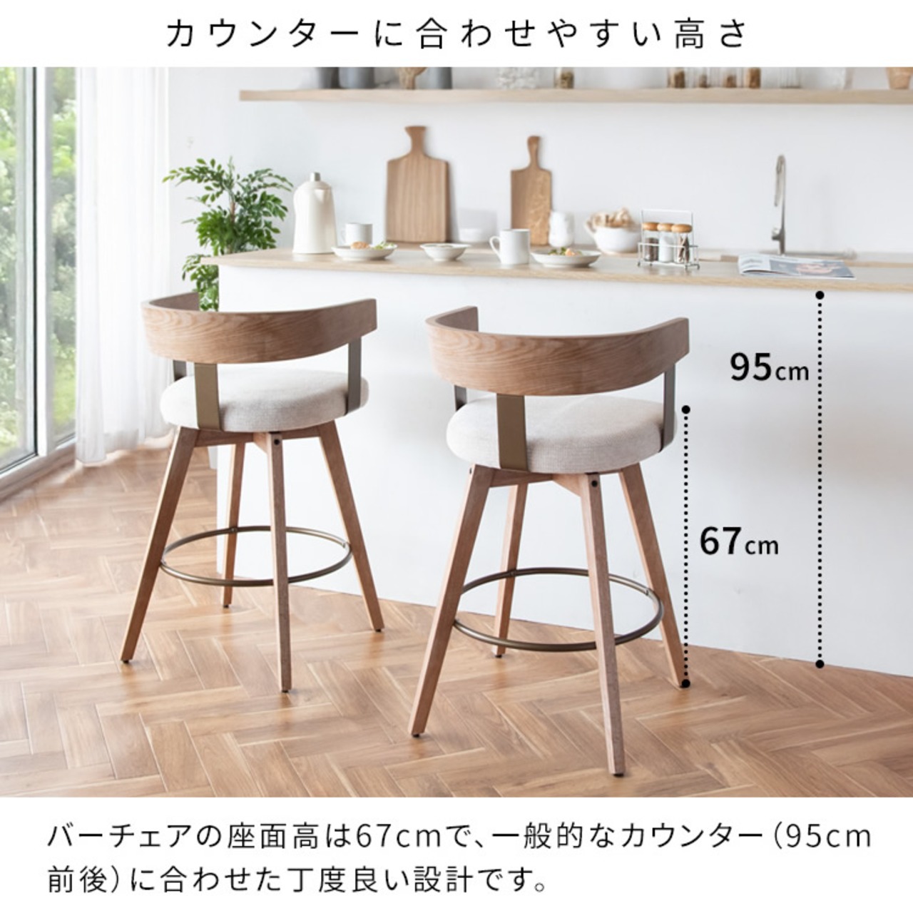 バーチェアの座面高(約)67cmとなっており、一般的なカウンター(高さ95cm前後)に合わせた丁度良い設計です。