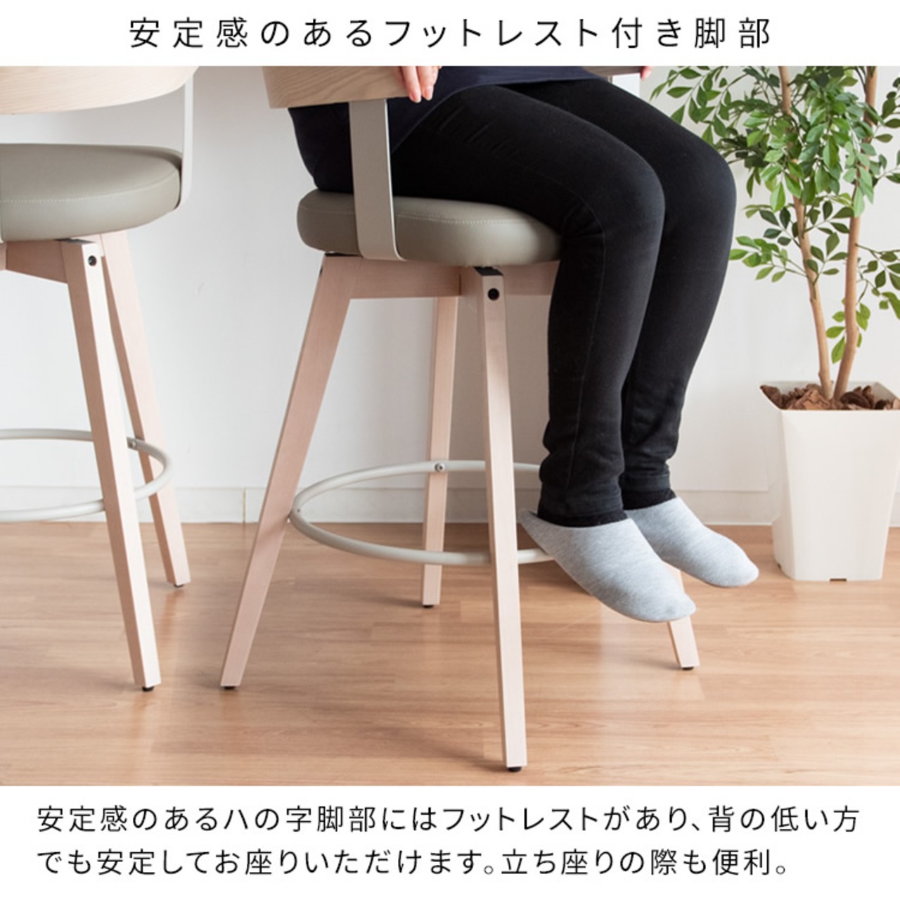 安定感のあるハの字脚部にはフットレストがあり、背の低い方でも安定してお座りいただけ、立ち座りの際にも便利です。