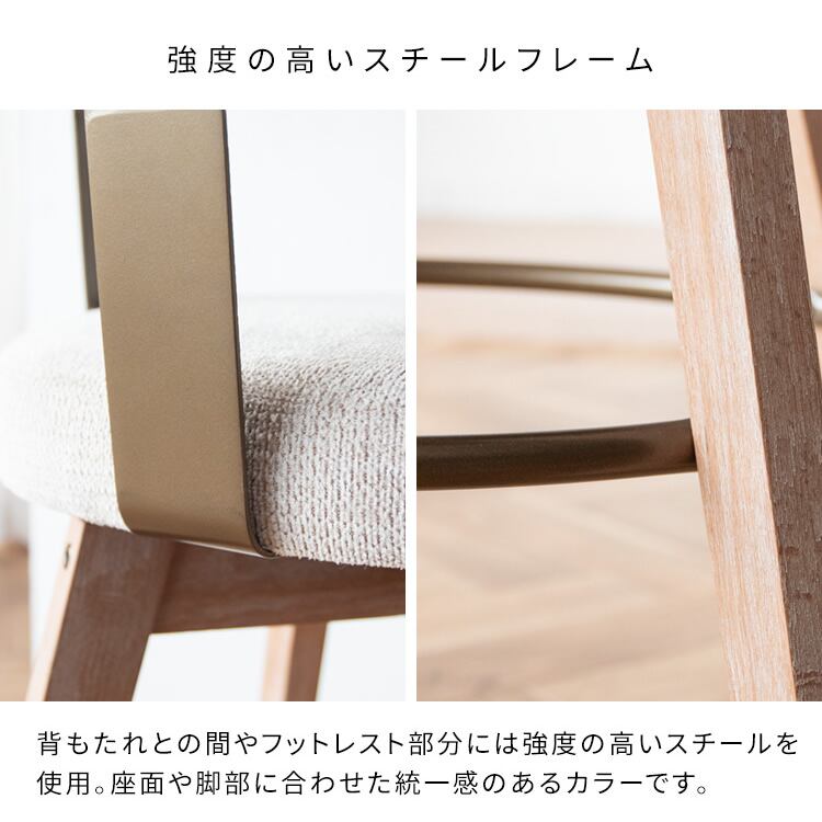 背もたれとの間やフットレスト部分には強度の高いスチールを採用しており、座面や脚部に合わせた統一感のあるカラーです。