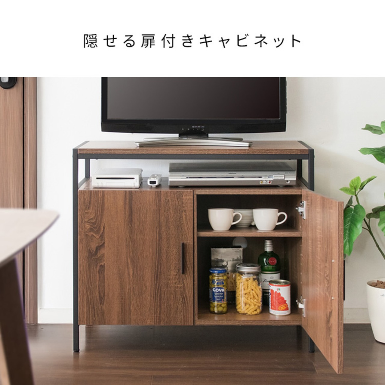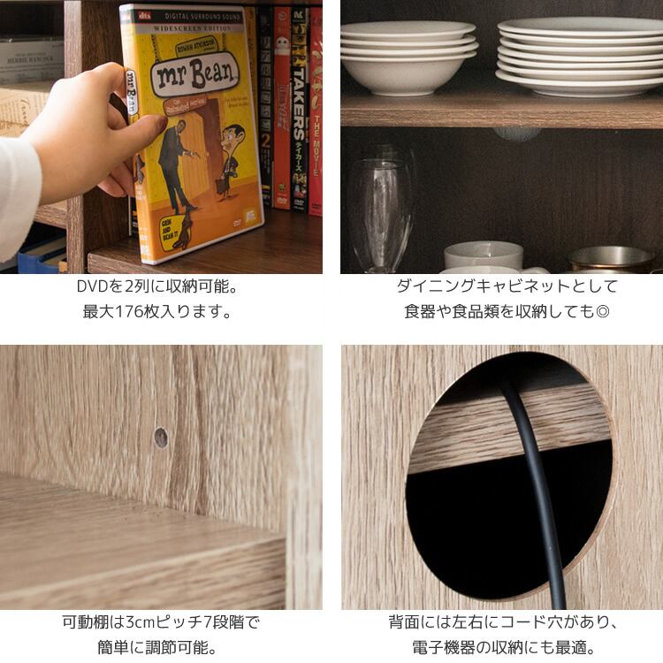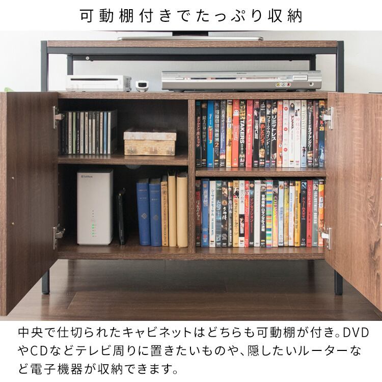 扉収納部分は、中央で仕切られており、どちらの棚も可動棚仕様となっており、DVDやCDなどの収納はもちろん、隠したいルーターなどの電子機器も収納可能です。