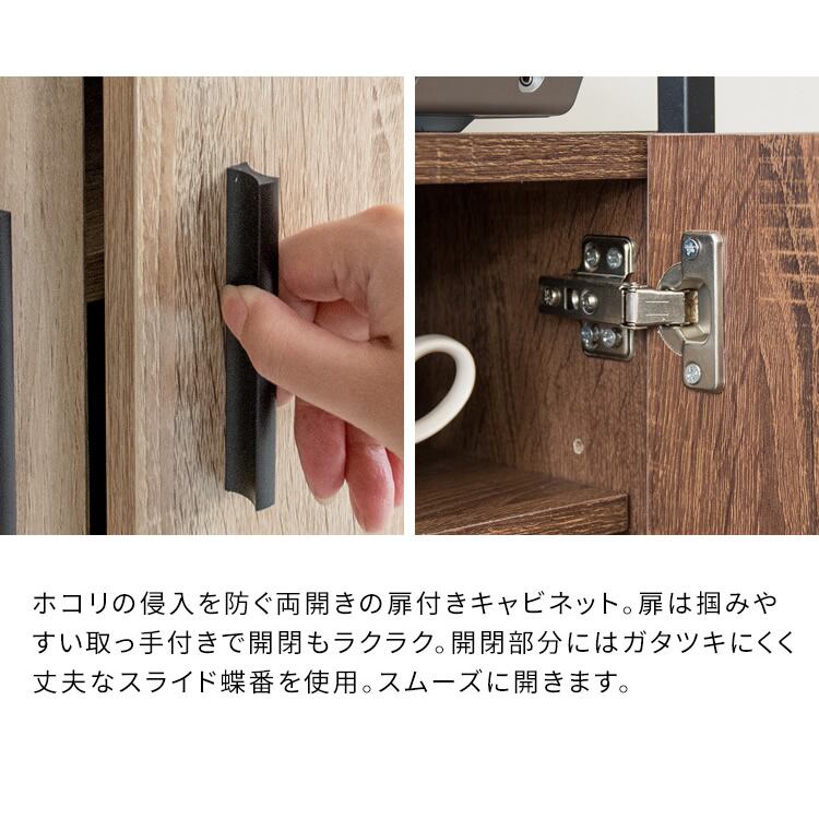 扉付きのキャビネット収納部分は、開閉部分にはガタつきにくい丈夫なスライド蝶番を使用しており、スムーズに開きます。