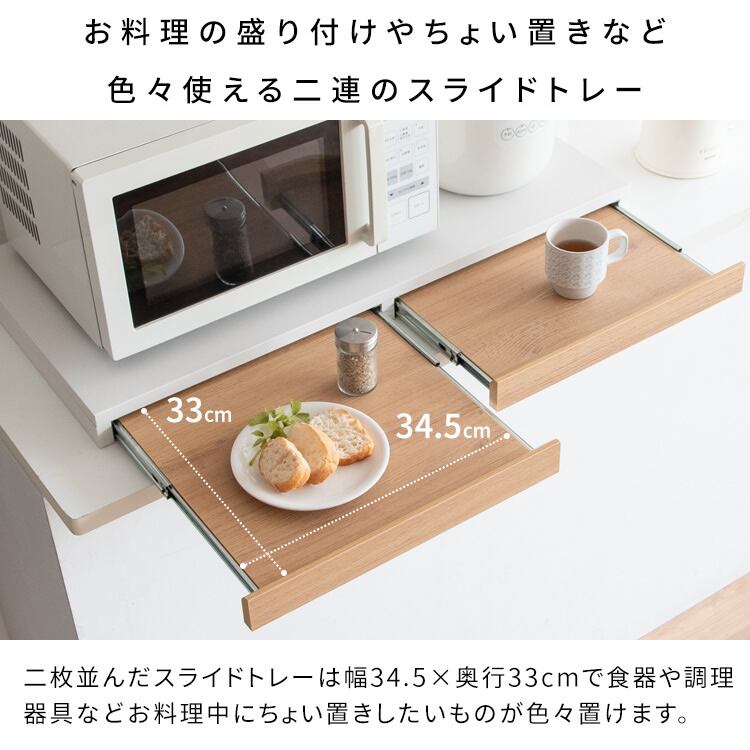 2枚並んだスライドトレーは1枚あたり幅(約)34.5cm、奥行(約)33cmで、食器や調理器具など、お料理中にちょい置きしたい物を色々と置くことができます。