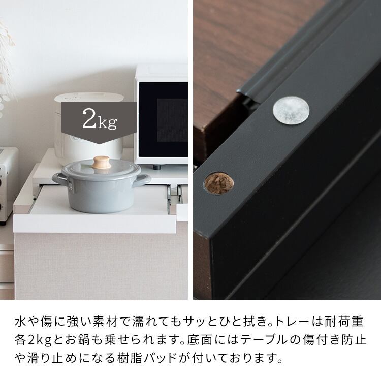 水や傷に強い素材で濡れてもサッとひと拭きでお手入れも簡単で、各トレーの耐荷重(約)2kgなので、お鍋も載せることができます。