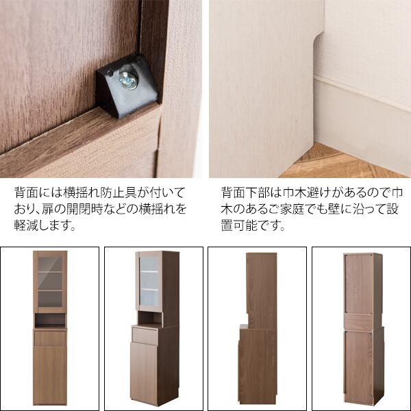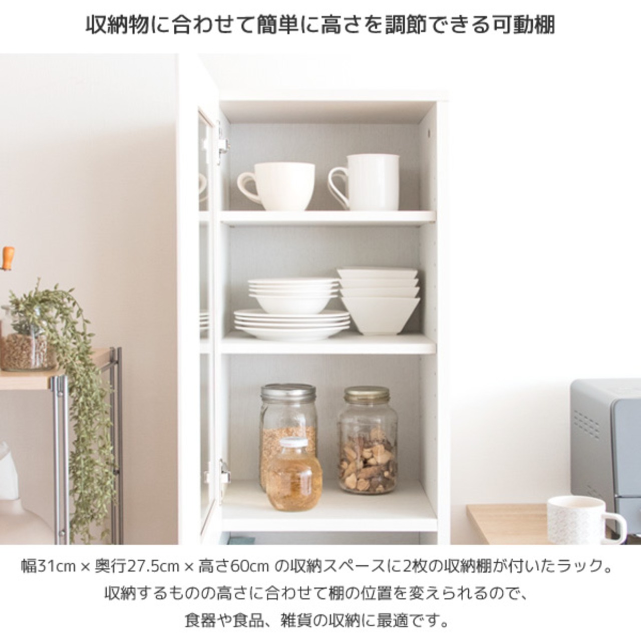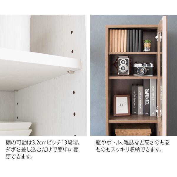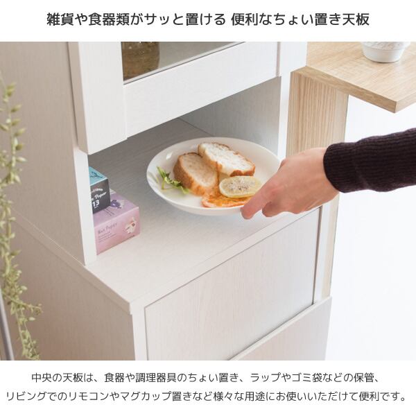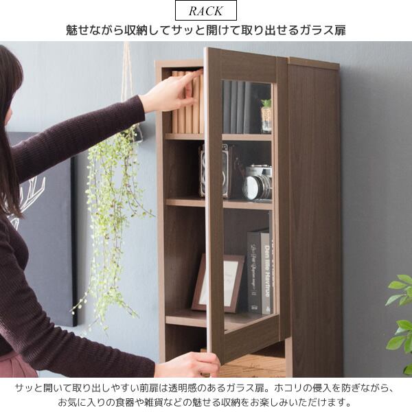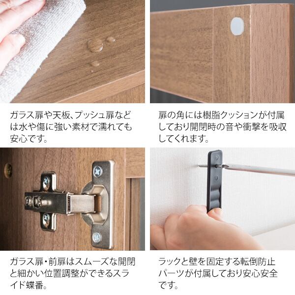 上部前扉は透明感のあるガラス扉を採用しており、ホコリの侵入を防ぎながら、食器や雑貨などの魅せる収納をお楽しみいただけます。
