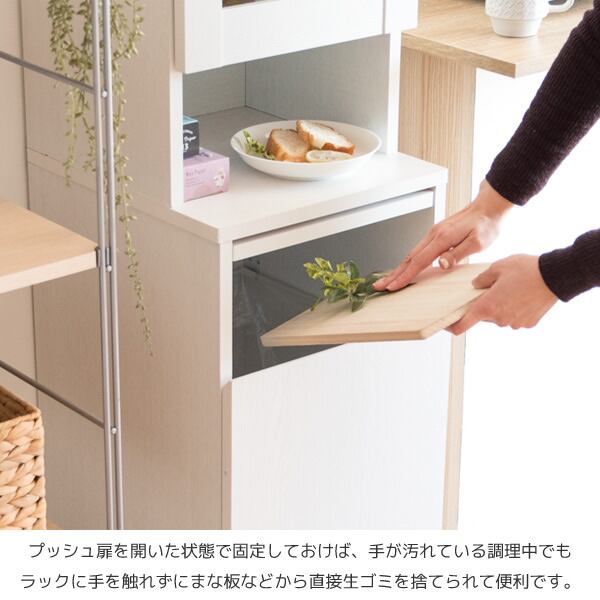 ゴミ箱部分のプッシュ扉は開けたまま固定することもできるので、手が汚れている調理中でも扉に触れず、まな板から直接生ごみなどを捨てることができます。