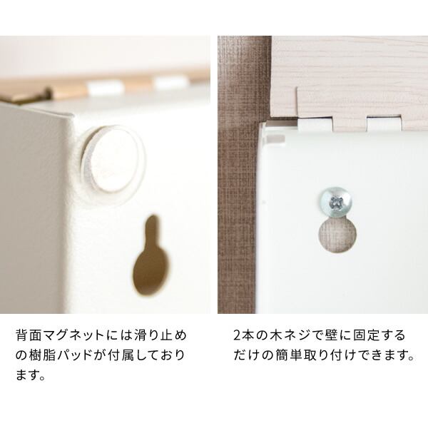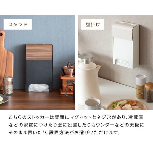 ストッカーは背面にマグネットとネジ穴があり、冷蔵庫などの家電に付けたり、壁に設置したりカウンターなどにそのまま置いたり、設置方法がお好みでお選びいただけます。