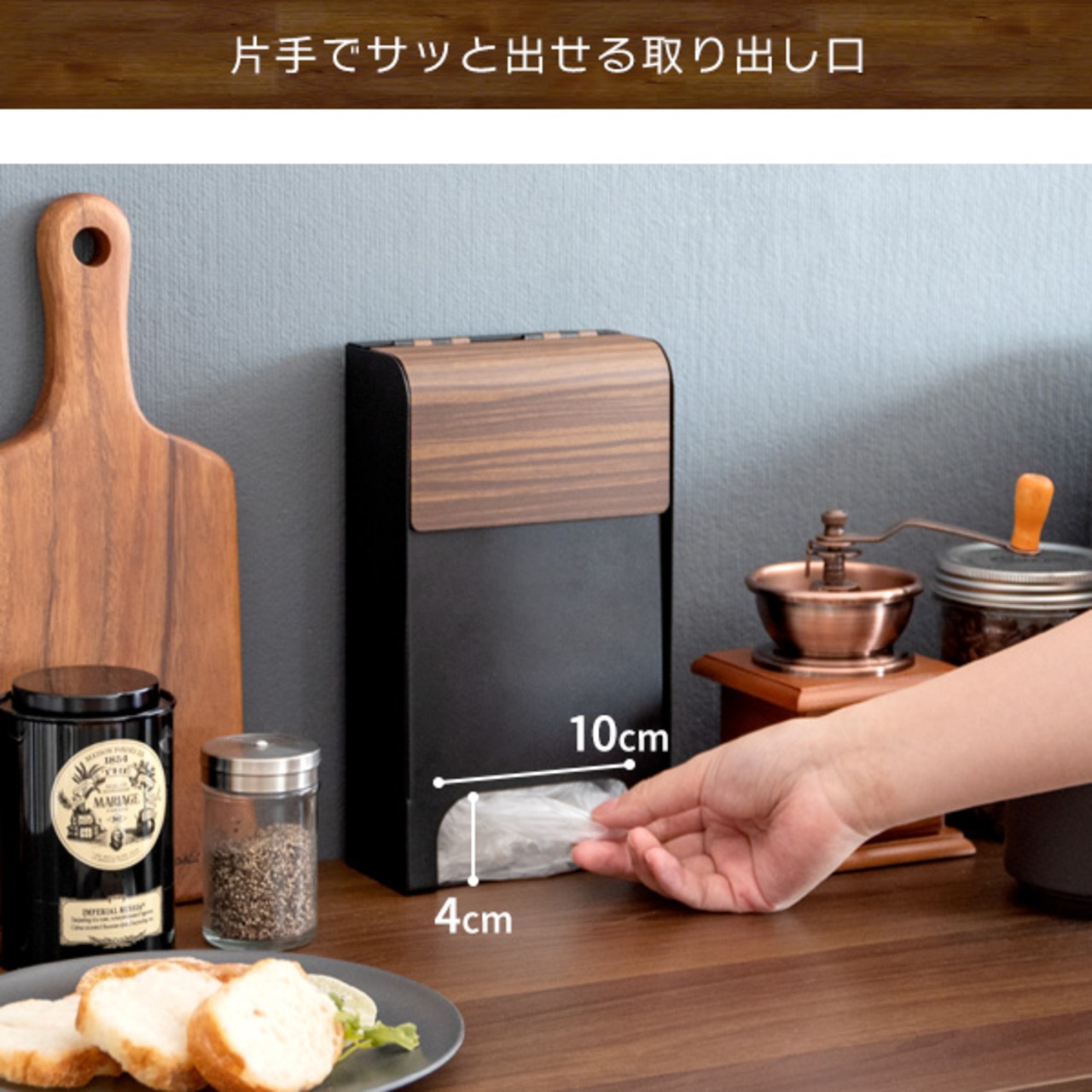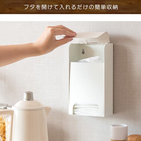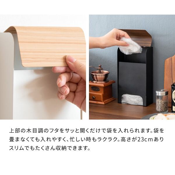 上部の木目調のフタをサッと開くだけで簡単に袋を入れることができ、袋を畳まなくても入れやすく、忙しい時も楽々です。