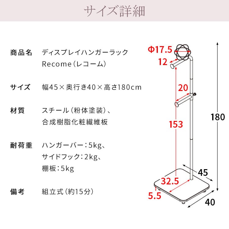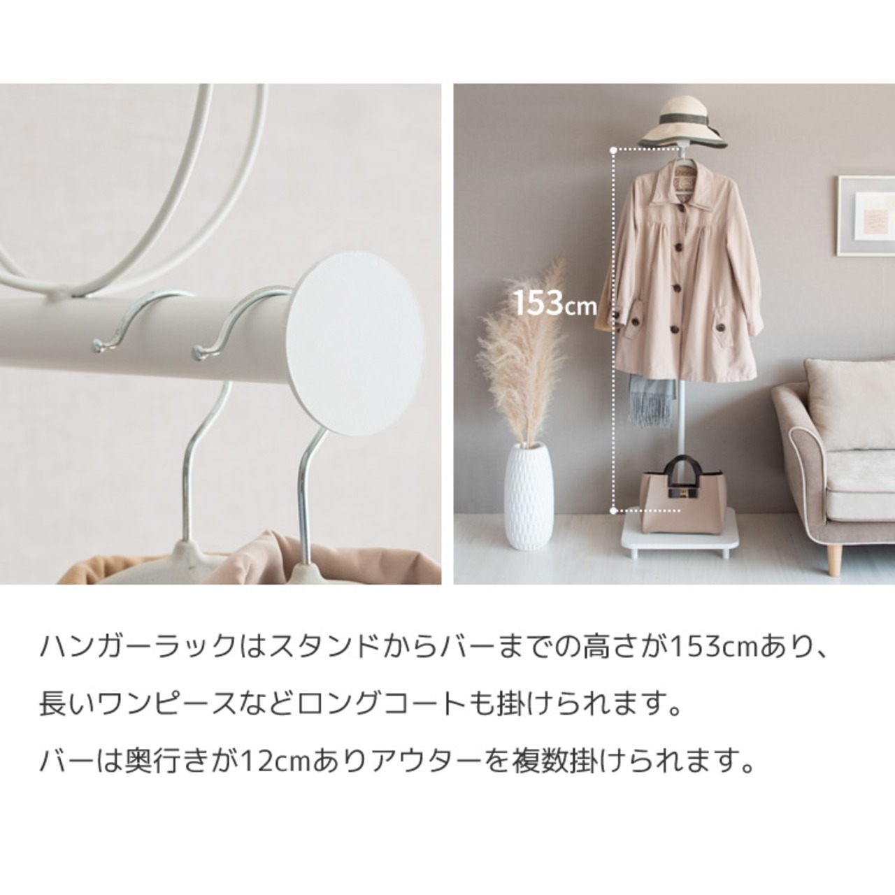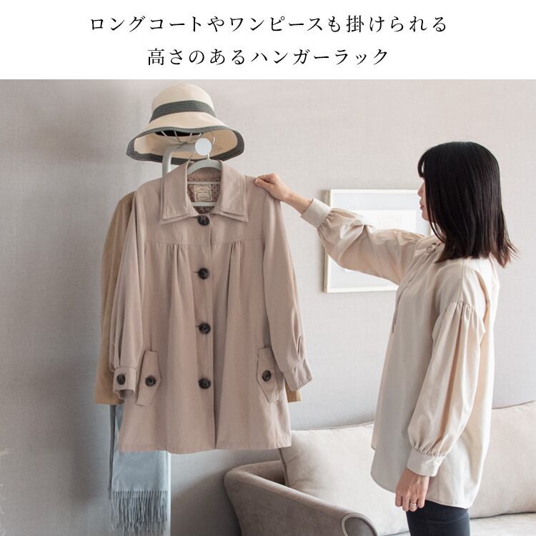 ロングコートやワンピースも掛けられる高さがあり、帽子やカバンまでまとめて収納可能なディスプレイハンガーラックです。