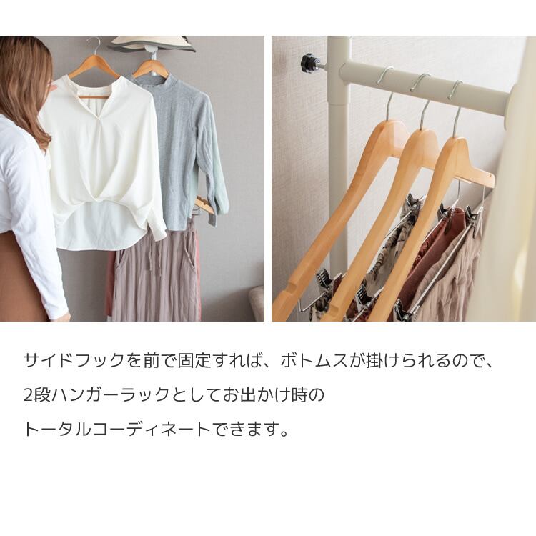 サイドフックを前で固定すれば、ボトムスを掛けることもできるので、二段ハンガーラックとしてもご使用可能です。