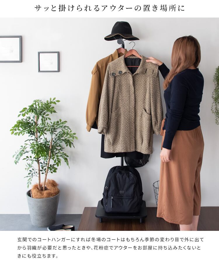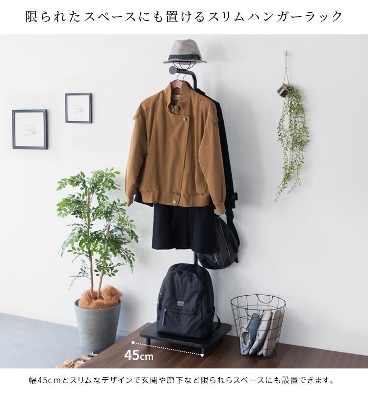 幅(約)45cmとスリムなデザインなので、リビングや寝室への設置はもちろん、玄関や廊下など、限られたスペースにも設置しやすいハンガーラックです。