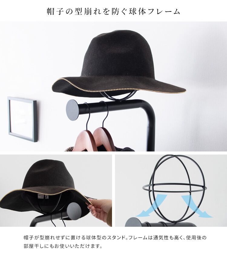 帽子が型崩れせずに置ける球体型のスタンドを備えており、フレームは通気性も良く、使用後の部屋干しにもご使用いただけます。