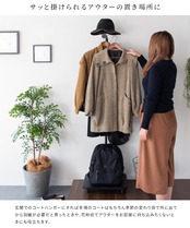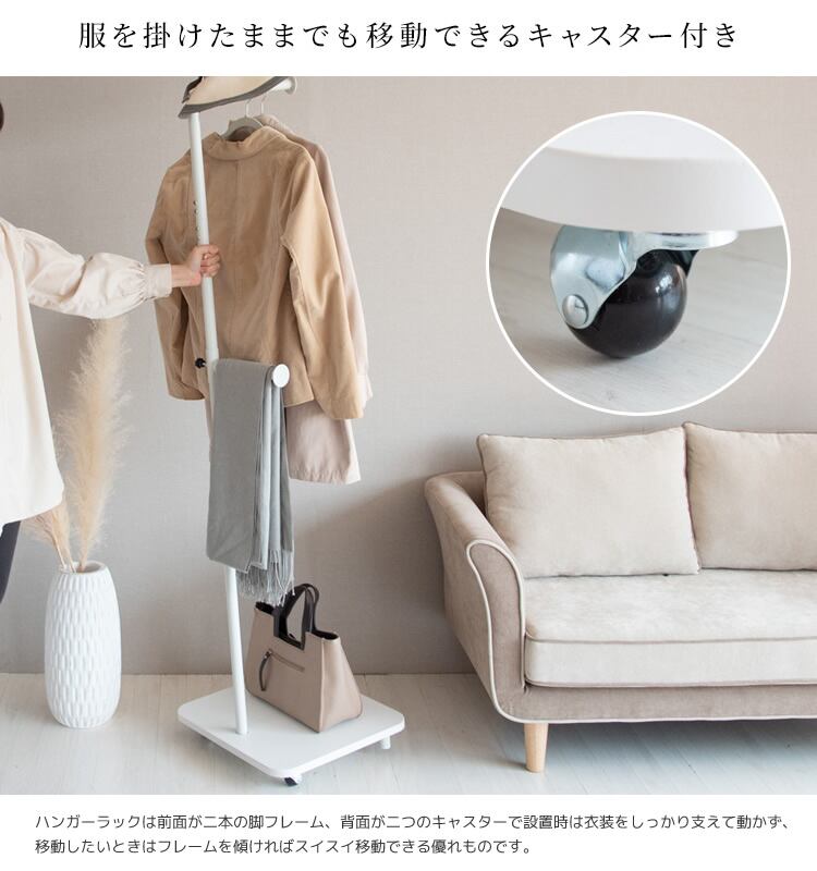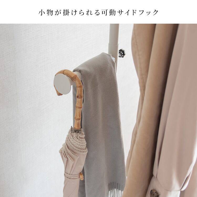 小物を掛けることができる可動仕様のサイドフック付きなで、調節ネジを回して簡単に高さを昇降することができ、ストールやカバンはもちろん、日傘などの小物類を掛けておくことができます。