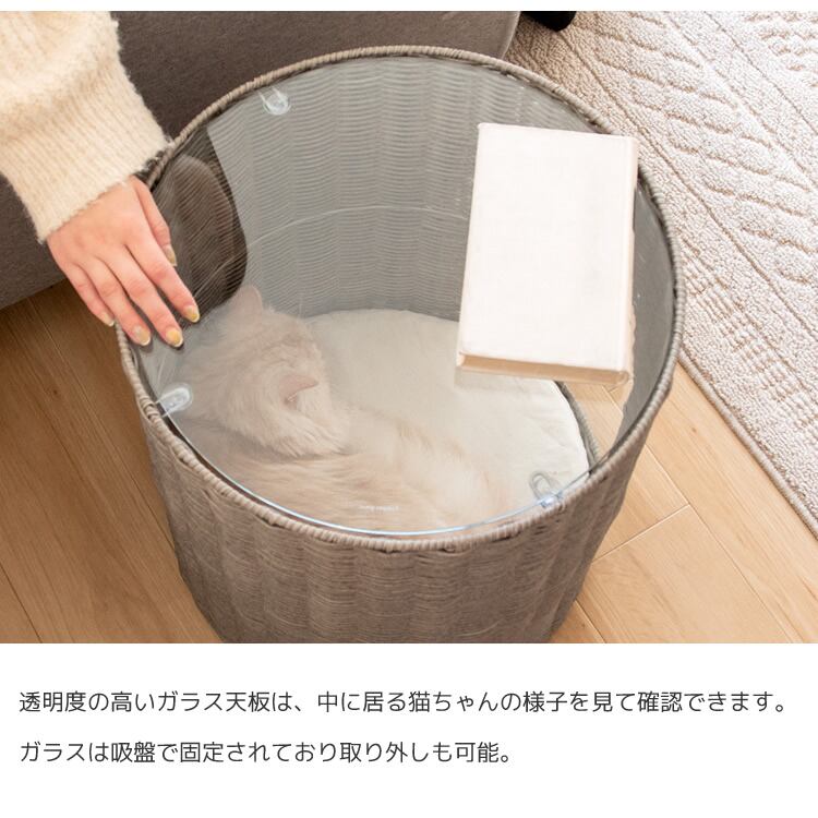透明度の高いガラス天板は、中に居る猫ちゃんの様子を見て確認しやすく、ガラスは吸盤で固定されているので取り外しも可能です。