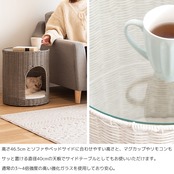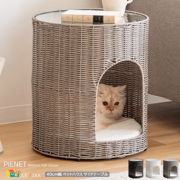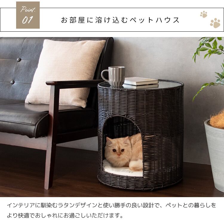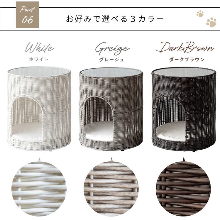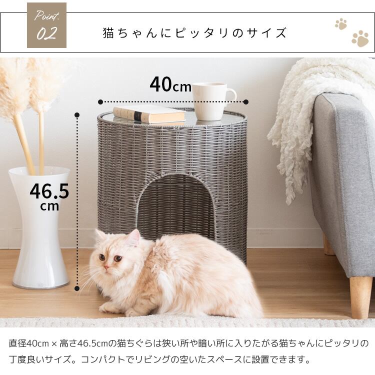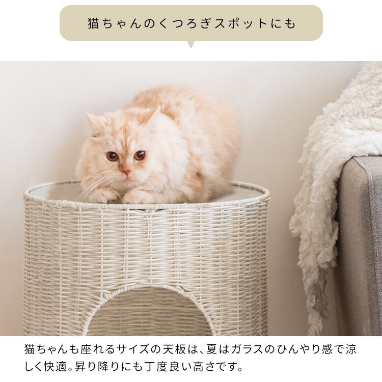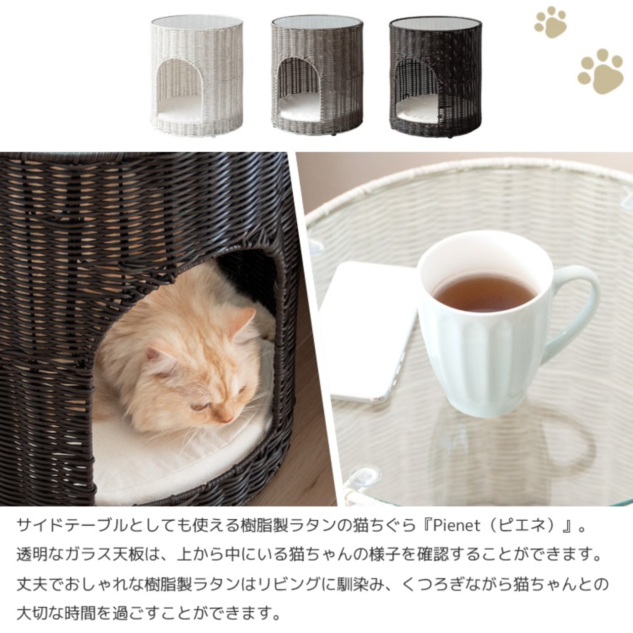 キャットハウス 40cm幅 ダークブラウン グレージュ ホワイト 猫ちぐら 猫用 ペットハウス クッション付き ガラステーブル サイドテーブル おすすめ おしゃれ 樹脂製ラタン使用 ベッドサイド ソファサイド 円型テーブル 丸形テーブル 丸テーブル 幅40cm 奥行40cm 高さ46.5cm