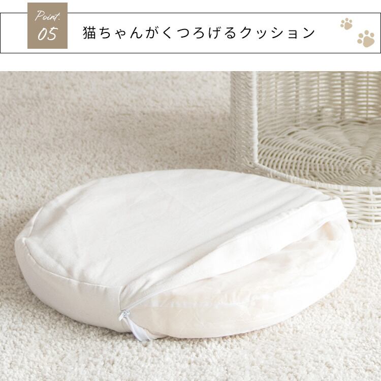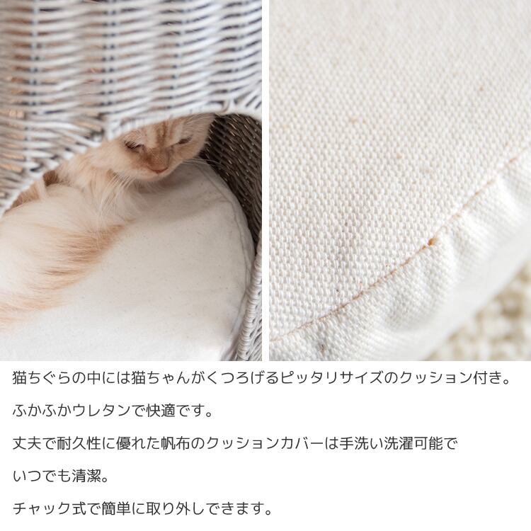 中には猫ちゃんがくつろげるピッタリサイズのクッションが付属しており、丈夫で耐久性に優れた帆布のクッションカバーは手洗い洗濯可能で、いつでも清潔にご使用いただけます。