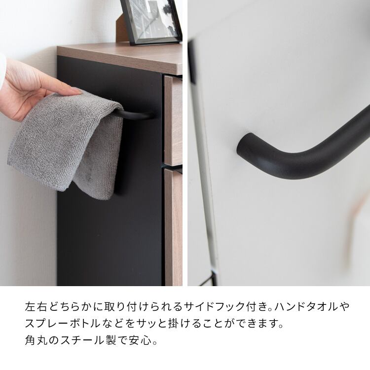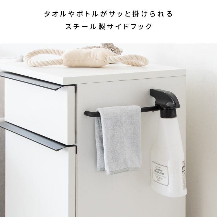 左右どちらかに取りけることができるサイドフック付きで、ハンドタオルやスプレーボトルなど、サッとかけることができ便利です。