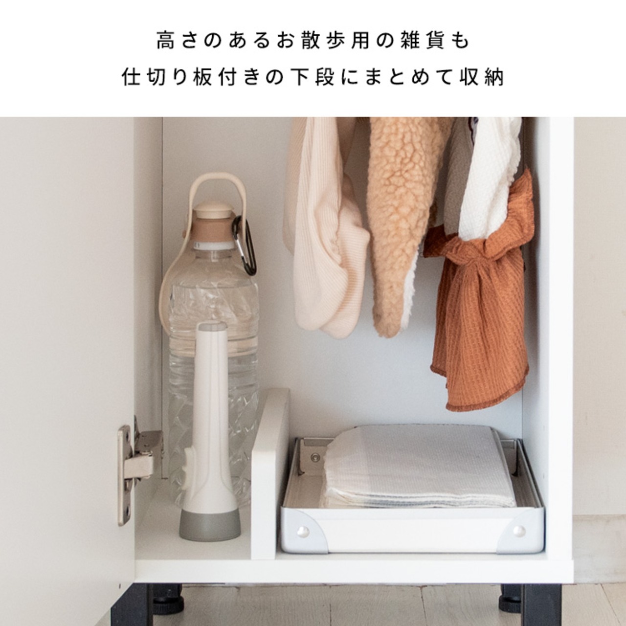 扉付きのデザインなので、生活感を隠しながらワンちゃんのハーネスやお洋服、お散歩シートやカバン、ハンディシャワーなど、お散歩に必要なものをまとめて収納することができます。