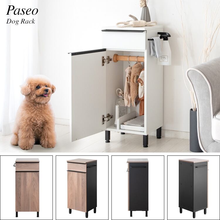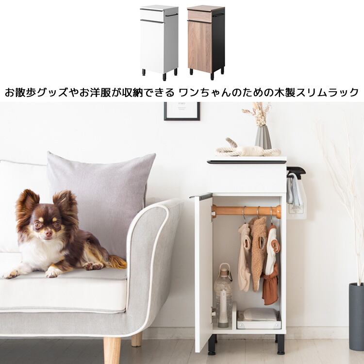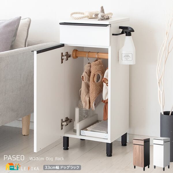 ドッグラック 33cm幅 ブラウン ホワイト 犬用品収納ラック ペット洋服ハンガーラック ペット用品収納ラック 扉付き収納 引き出し収納 おすすめ おしゃれ 北欧 モダン スタイリッシュ スリム コンパクト 省スペース 幅33cm 奥行29.5cm 高さ76.5cm ハーネス収納 犬用品ラック