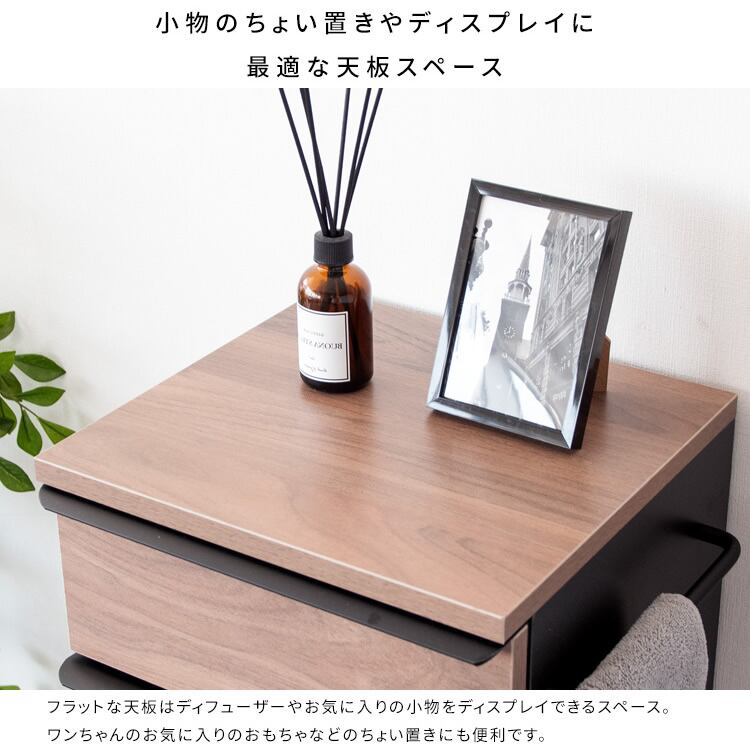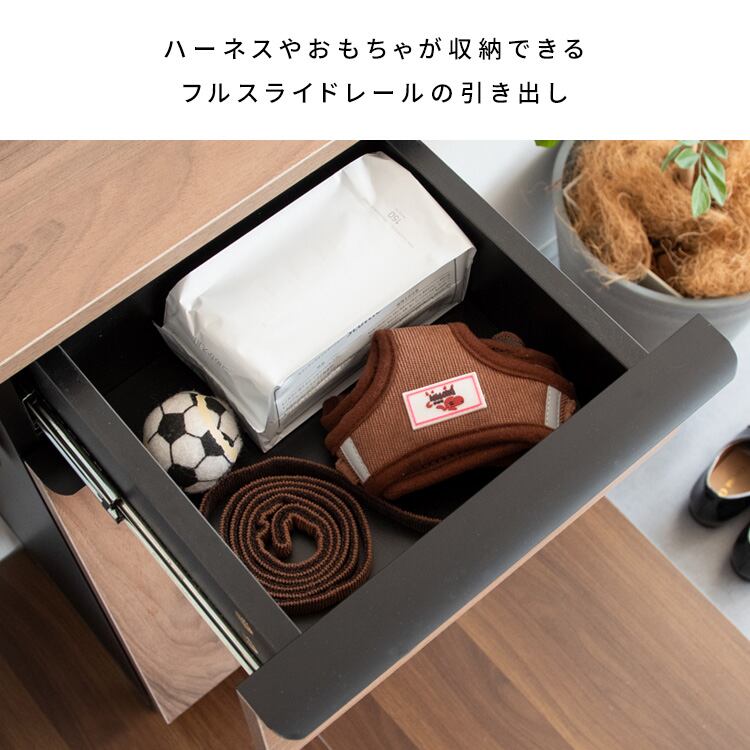 上段引き出しには、ハーネスやおもちゃ、ウェットシートなどの小物類をまとめて収納な能な引き出し収納が付いています。