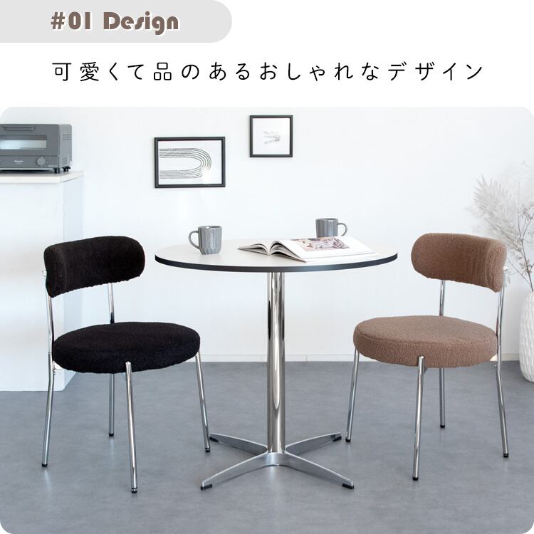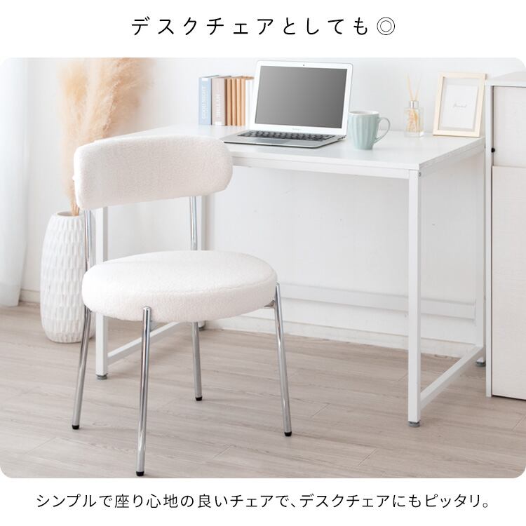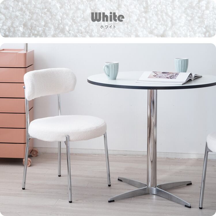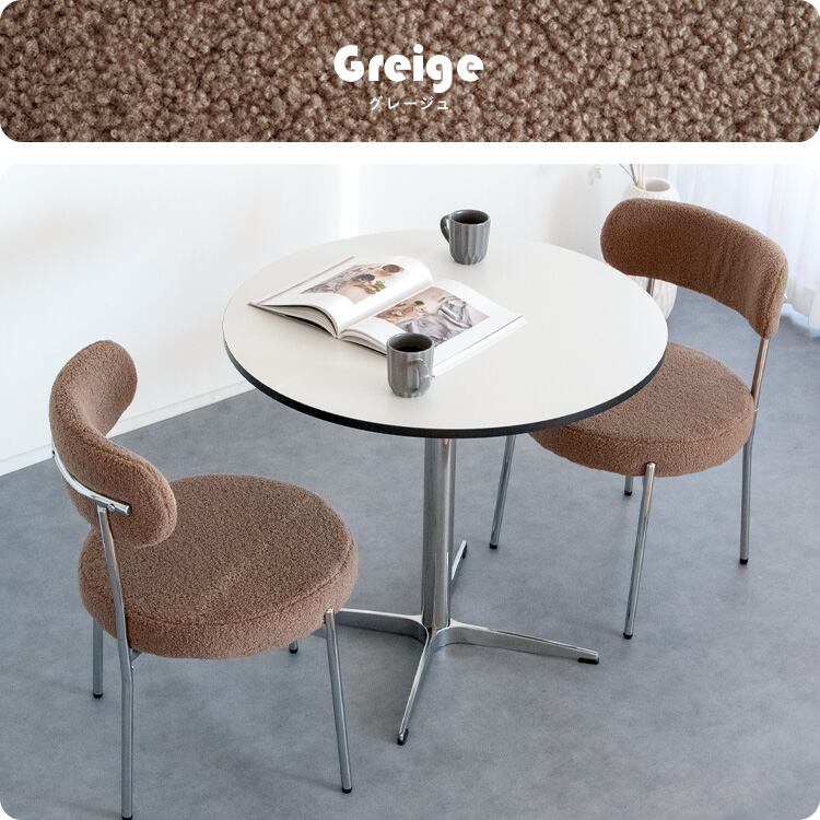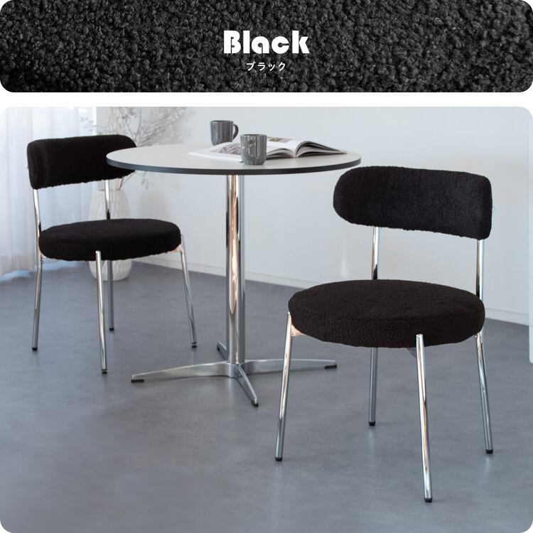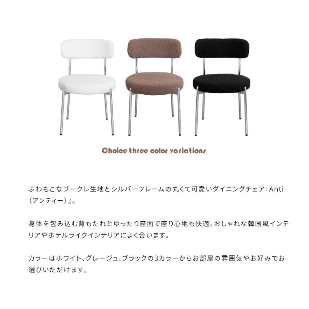 ダイニングチェア 48cm幅 ブラック グレージュ ホワイト ブークレ生地 肘掛け無し 肘置き無し アームレスチェア 円形座面 丸型座面 おすすめ おしゃれ モダン スタイリッシュ スチール脚 ブークレ デスク用チェア ワークチェア 幅48cm 奥行50cm 高さ74cm 座面高44.5cm 椅子