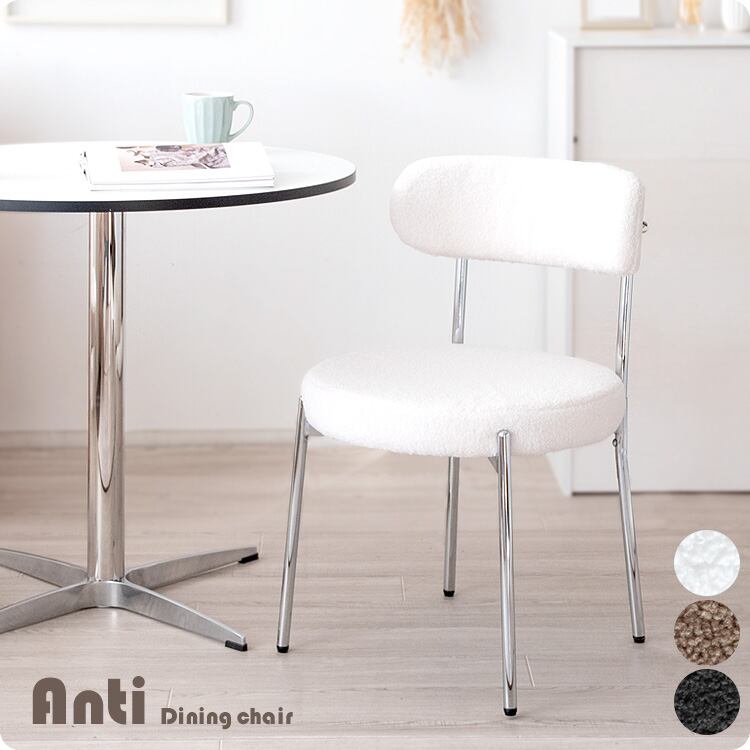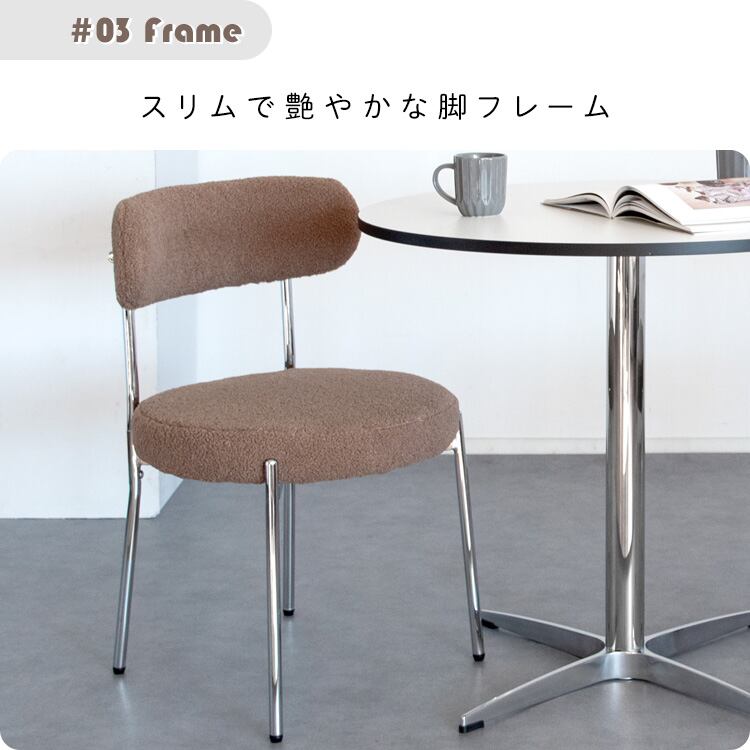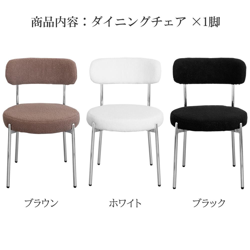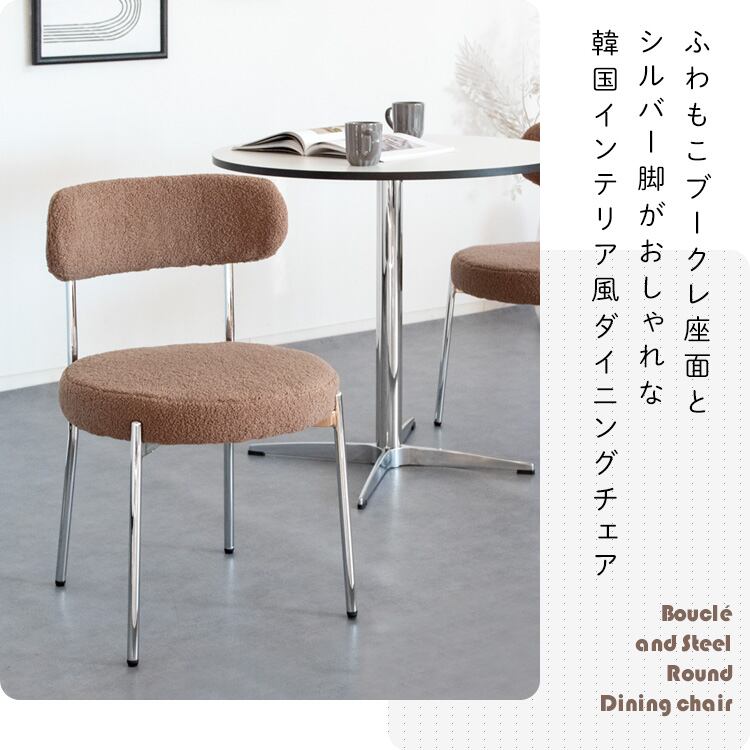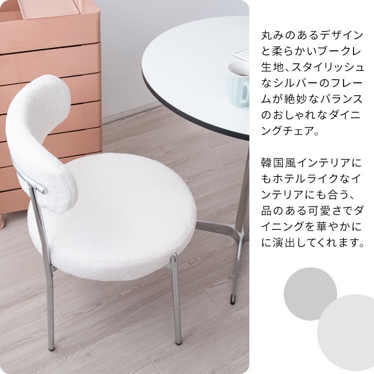 丸みのあるデザインと柔らかいブークレ生地、スタイリッシュなシルバーのフレームが絶妙なバランスのおしゃれな48cm幅のダイニングチェア1脚単品です。