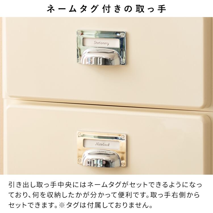引き出し取っ手中央にはネームタグがセットできるようになっており、何を収納下かがわかって便利です。(タグは付属していません。)