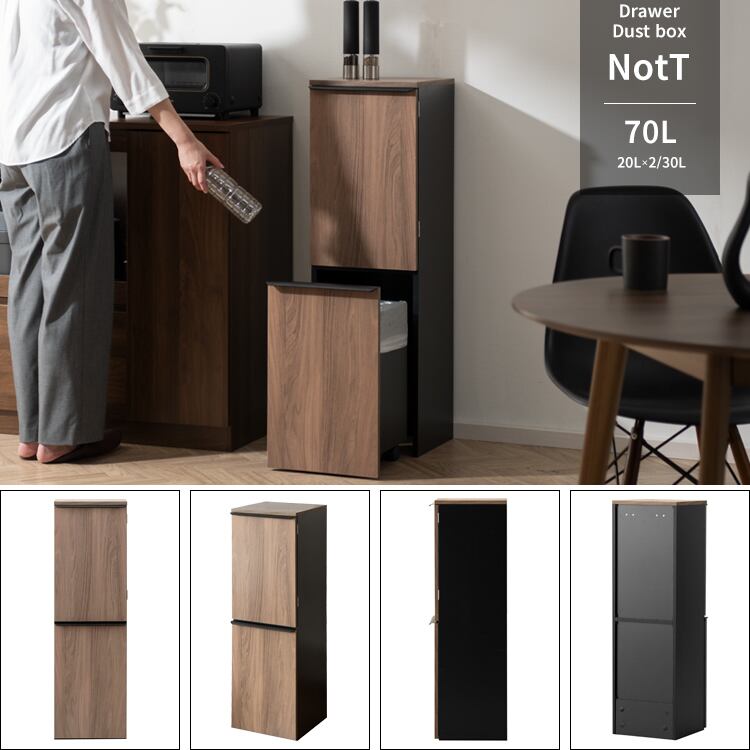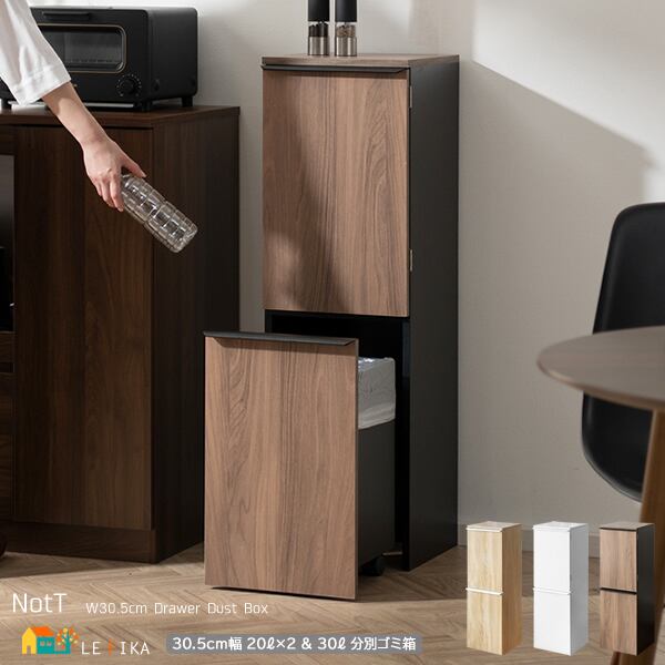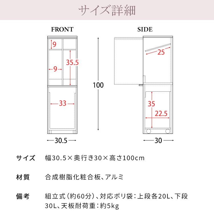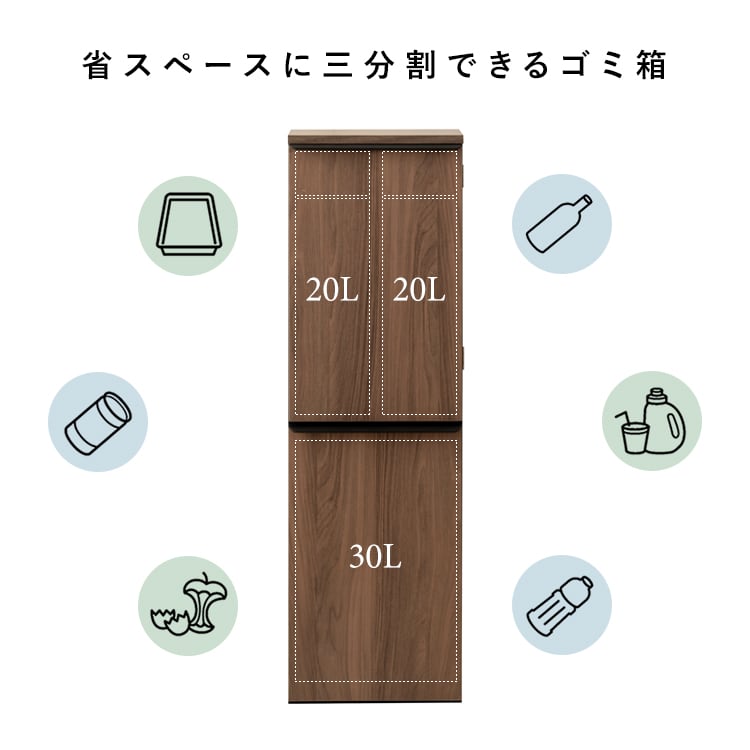 上段は20リットル×2、下段は30リットルの3種類にゴミを分けて捨てることができる30.5cm幅の分別ごみ箱です。