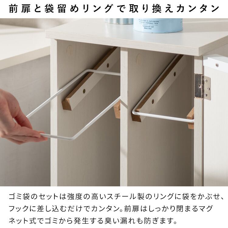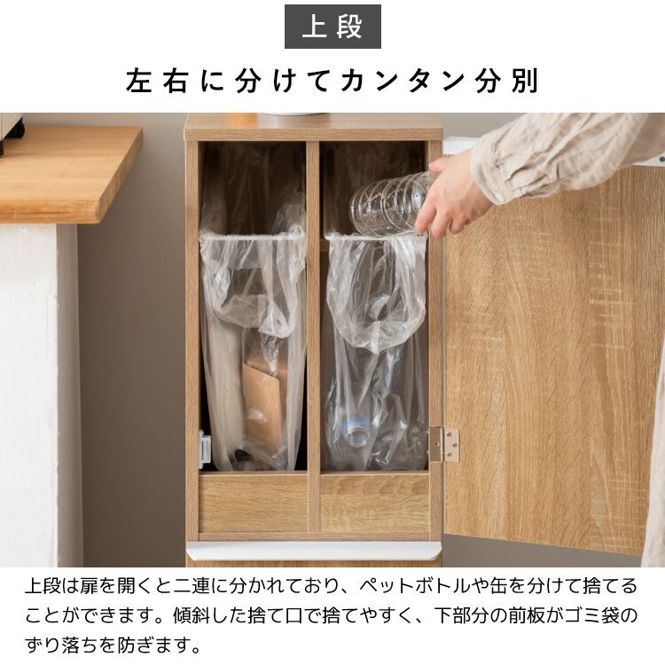 上段は扉を開くと二連に分かれており、傾斜した捨て口でゴミが捨てやすく、ペットボトルや缶を分けて捨てることができ、下部分の前板がゴミ袋がずり落ちるのを防いでくれます。
