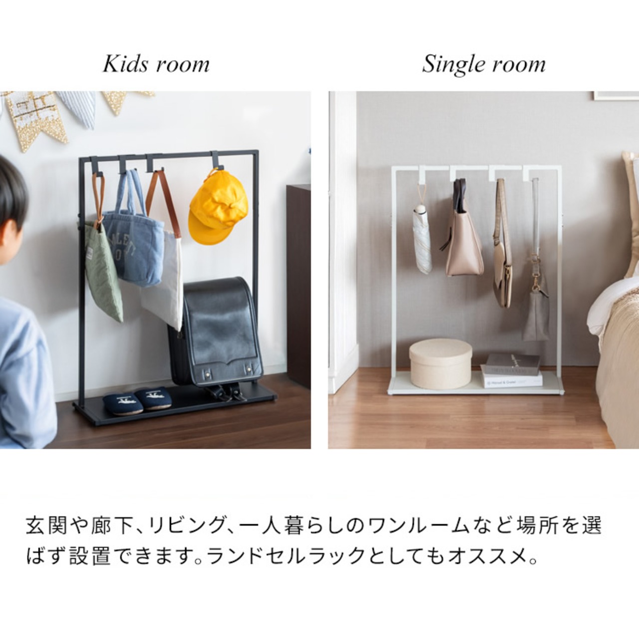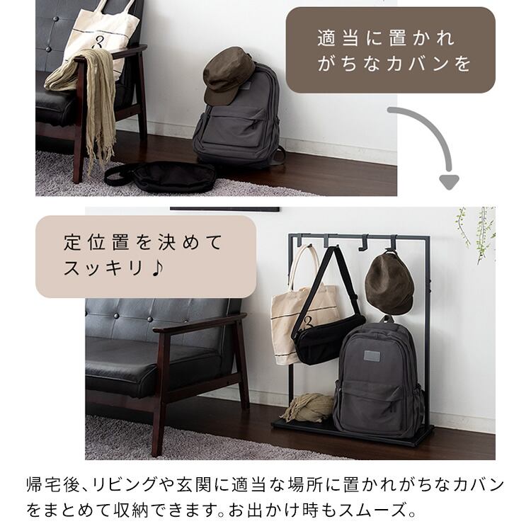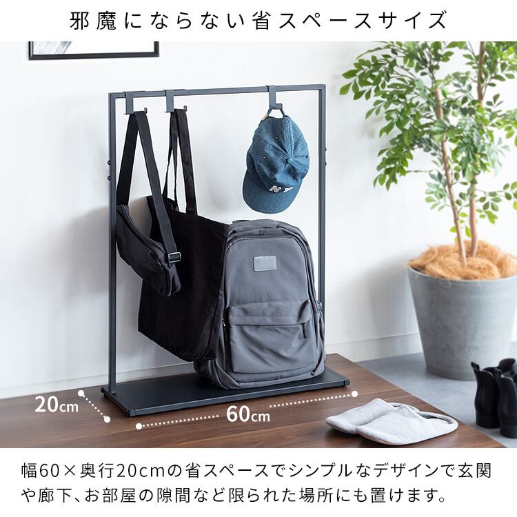 スリムなサイズ感でリビングでの使用はもちろん、玄関や廊下、子供部屋など色んな場所に設置しやすい60cm幅のバッグハンガーラックです。