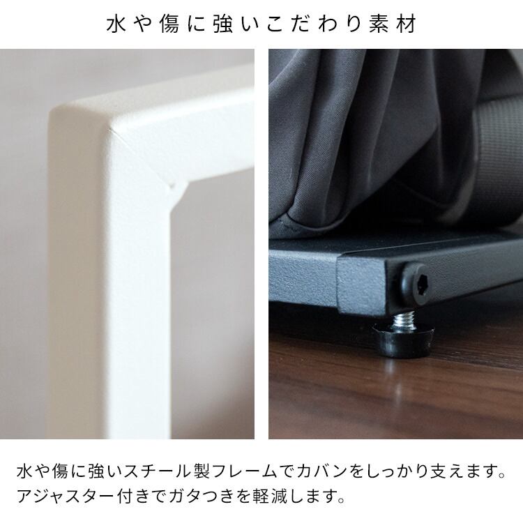 水や傷に強いスチール製で、カバンをしっかりと支え、足元にはアジャスター付きでガタつきを軽減します。