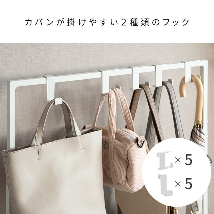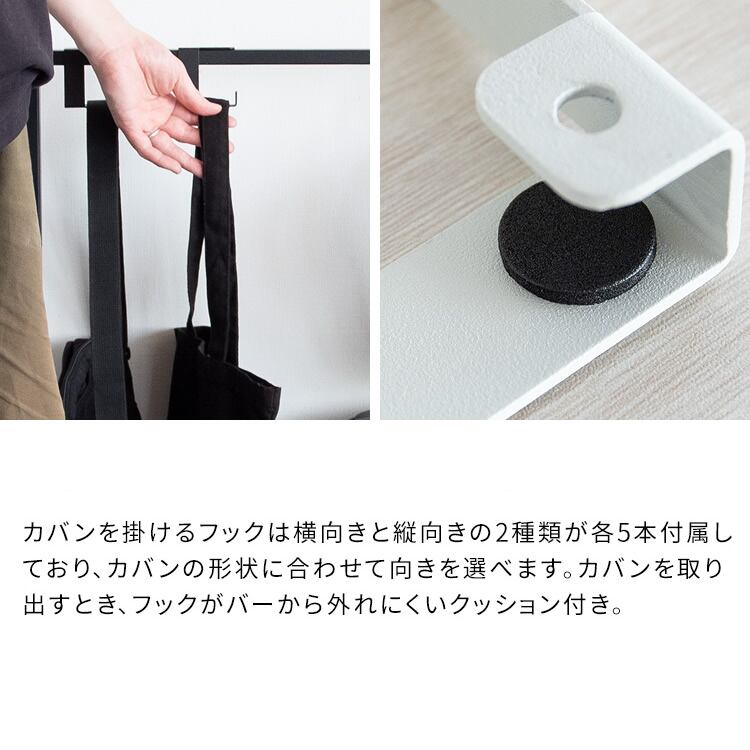 カバンを掛けるフックは横向き5本、縦向き5本、付属しており、カバンの形状によって掛ける方向を選ぶことができます。