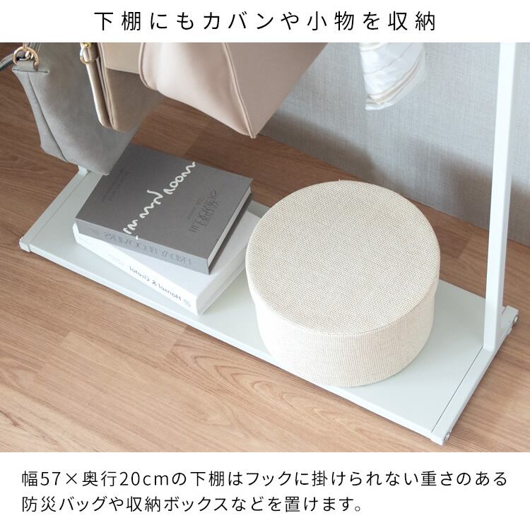 フックに掛けるk十ができない重さのある防災バッグや収納ボックスなどを置いておくことができる下棚付きです。