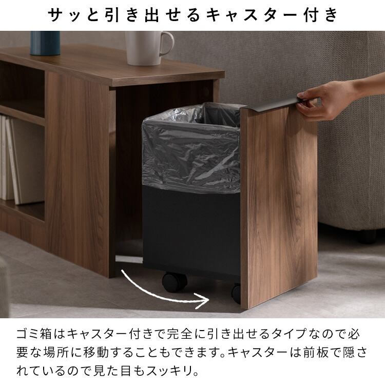 ゴミ箱はキャスター付きで完全に引き出せるタイプなので必要な場所に簡単に移動もでき、キャスターは前板で隠されているのでスッキリとしたデザインです。