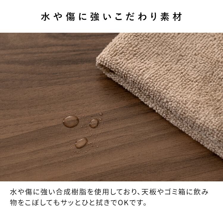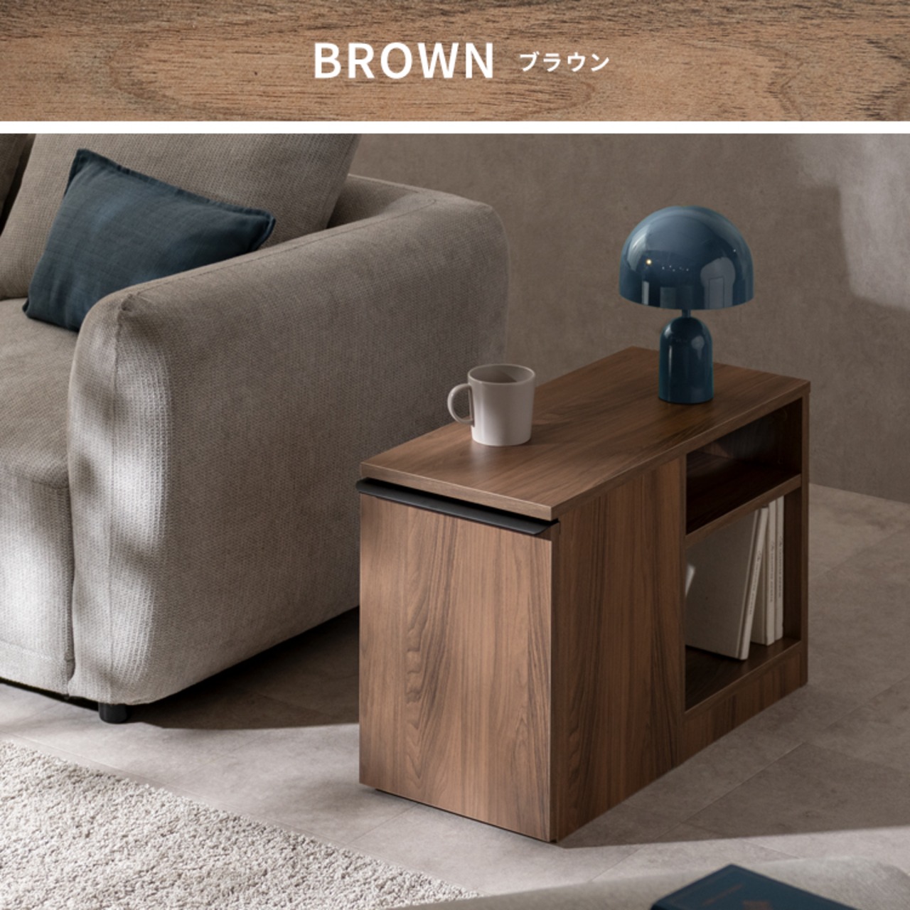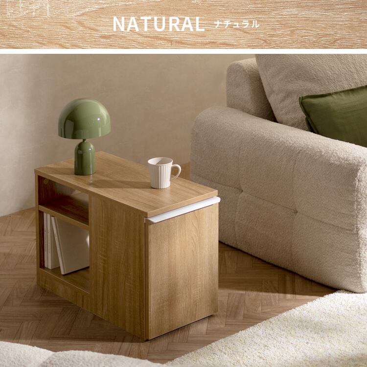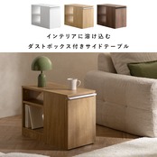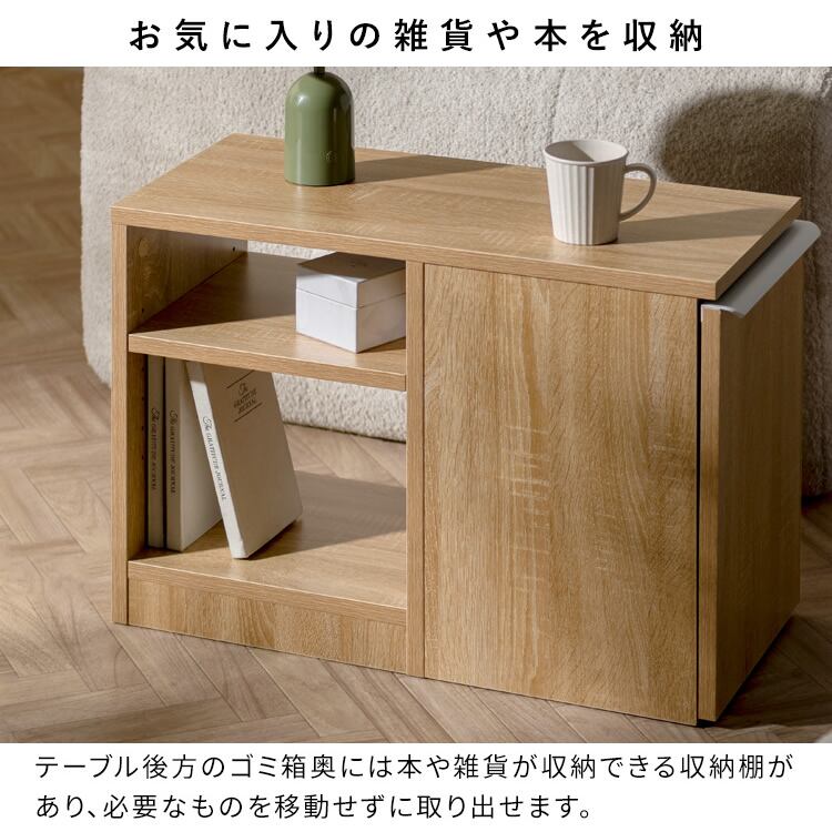 美しい木目調で前側がごみ箱には見えないデザイン性と機能性を備えた65cm幅のゴミ箱付きサイドテーブルです。