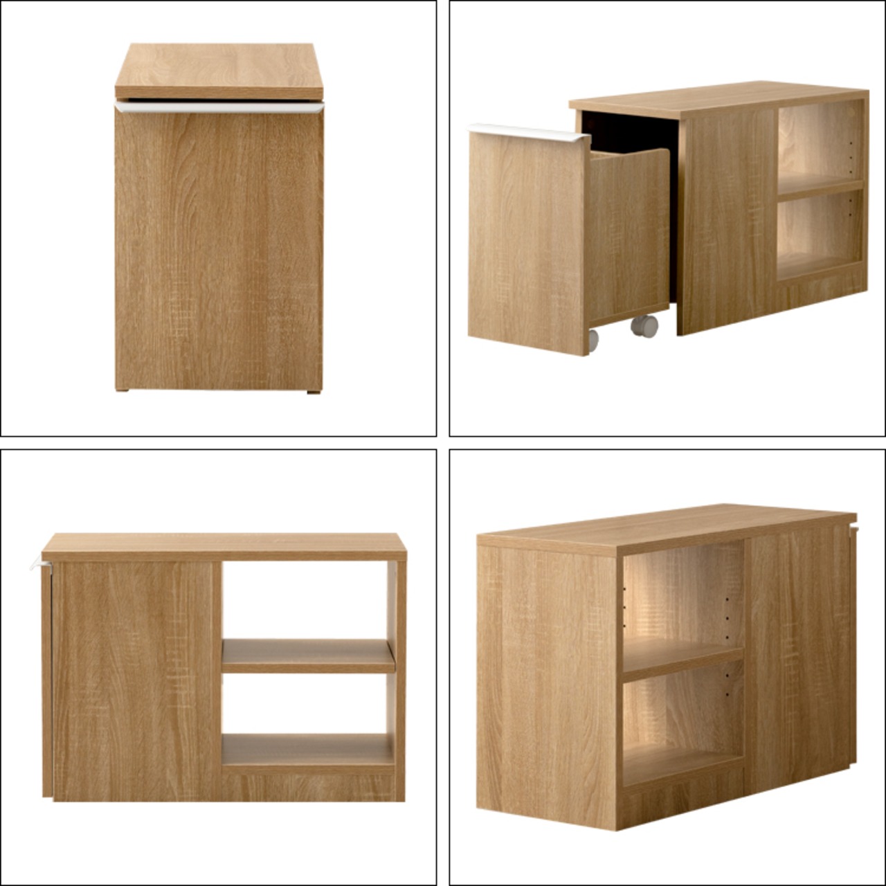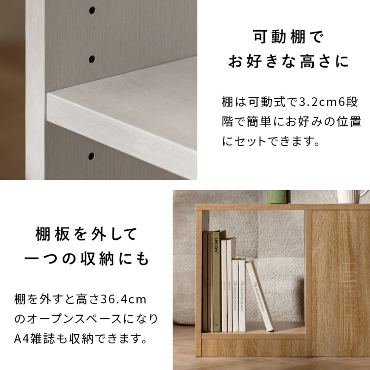 テーブル後方のゴミ箱奥には本や雑誌が収納できる収納棚付きで、可動棚仕様なので収納物の高さに合わせて調節が可能です。