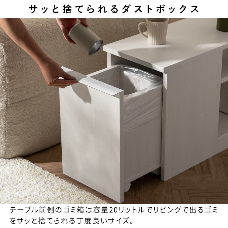 テーブル前側のゴミ箱は容量20リットルでリビングで出るごみをサッと捨てられる丁度良いサイズ感です。
