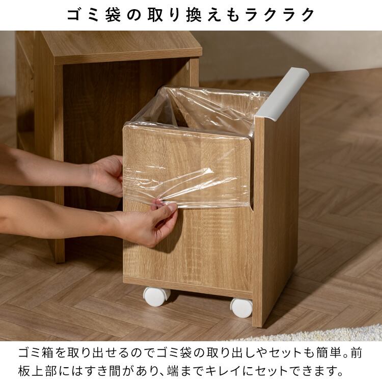 ゴミ箱を取り出すことができるので、ゴミ袋の取り出しやセットも簡単で、前板上部には隙間があり、端までキレイにセットすることができます。