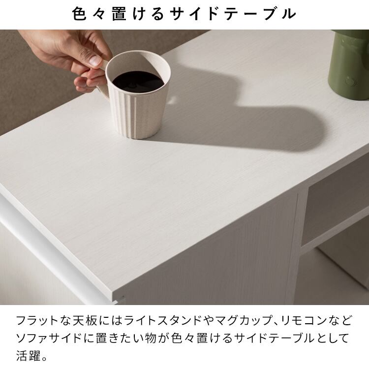 フラットな天板にはライトスタンドやマグカップ、リモコンなどソファサイドに置きたい物を色々と置くことができ、サイドテーブルとして活躍します。