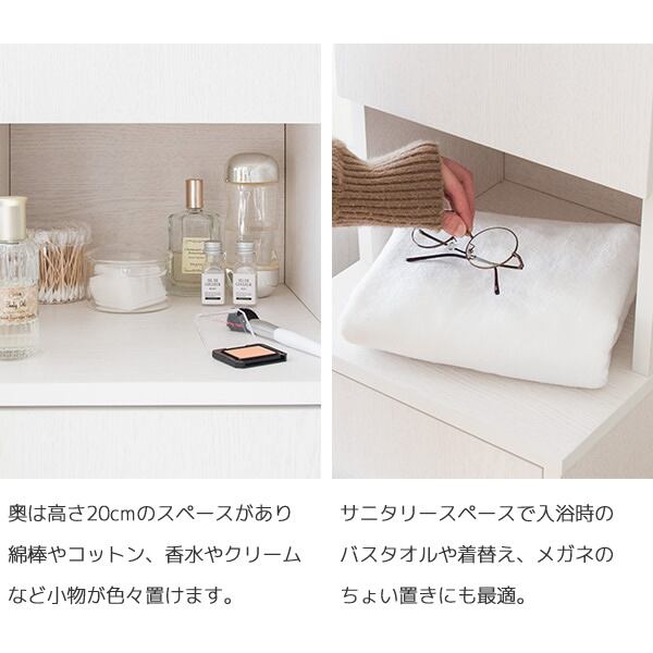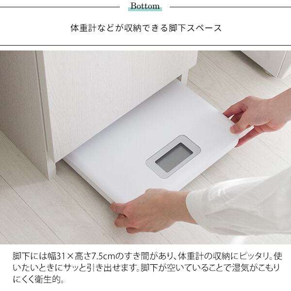 脚元は、体重計などを収納するのにぴったりの幅(約)31cm、高さ約7.5cmのすき間を設けており、さらに脚下が空いていることで湿気もこもりにくく衛生的にご使用いただけます。