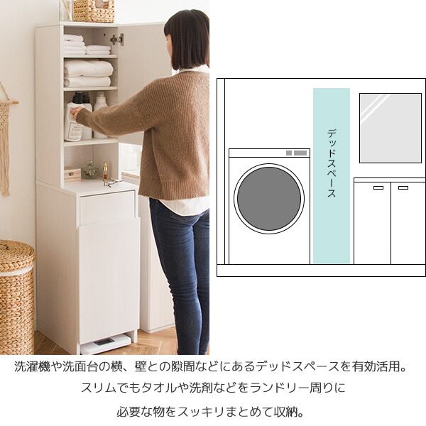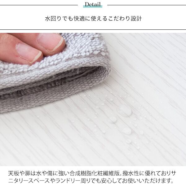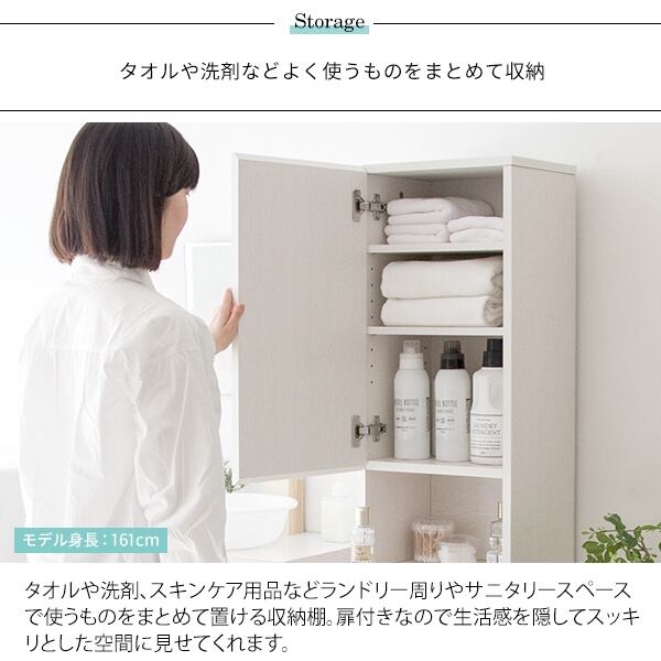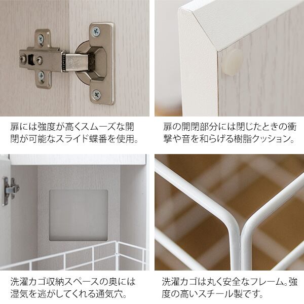 タオルや洗剤などのランドリー周りに必要な物をしっかりと収納できることはもちろん、洗濯物を隠せるスイング扉付きの洗濯カゴ付きでなので、脱いだ衣類や使ったタオルなど、生活感をうまく隠してスッキリと見せることができます。