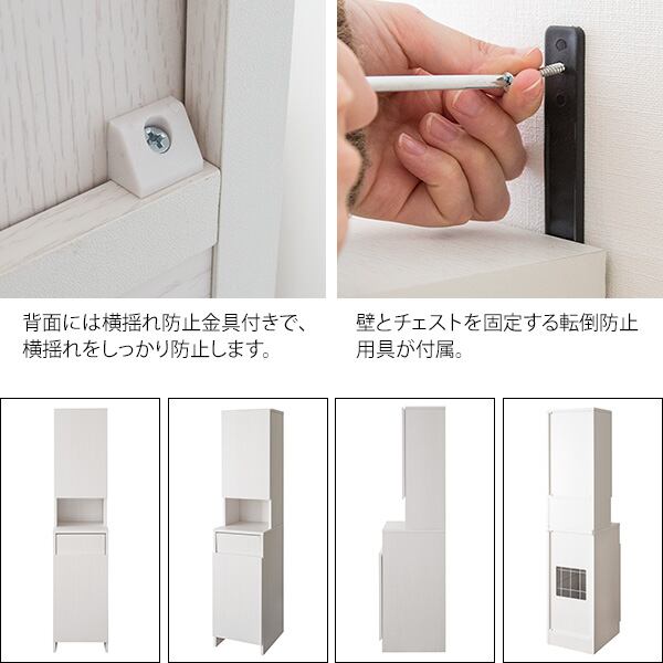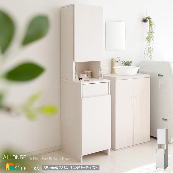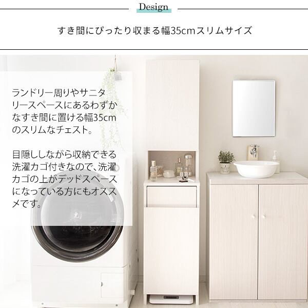 ランドリー周りやサニタリースペースにあるわずかなすき間に設置できる35cm幅のスリムサイズのサニタリーチェストです。