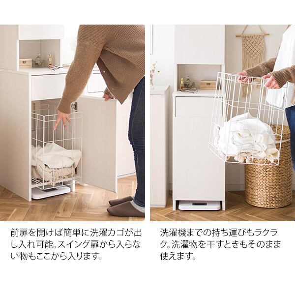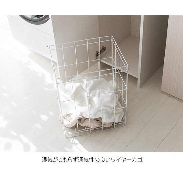前扉を開けば簡単に洗濯カゴを出し入れできるので、洗濯機までの持ち運びも簡単なうえに、湿気がこもりにくい通気性の良いワイヤーカゴを採用しており、洗濯物を干すときもそのまま使用することができます。